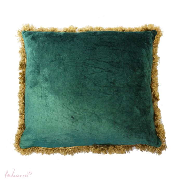 Dit kussen van velours met een korte vleug en een subtiele mooie glans is in vier kleuren verkrijgbaar. Om het kussen een verdiende royal look te geven, is het afgezet met een rand vol franjes in een antique mat gouden tint. De franjes zijn gemaakt van gerecycled garen.